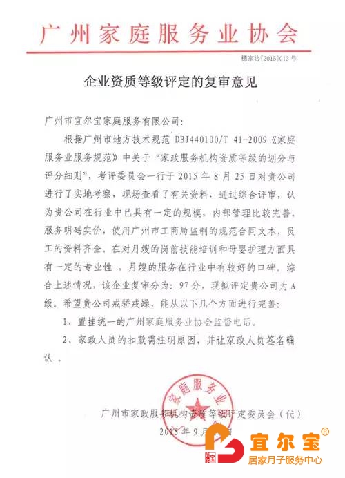 根據(jù)廣州市地方技術(shù)規(guī)范DBJ440100/T 41-2009《家庭服務(wù)業(yè)服務(wù)規(guī)范》中關(guān)于“家政服務(wù)機(jī)構(gòu)資質(zhì)等級(jí)的劃分與評(píng)分細(xì)則”,考評(píng)委員會(huì)一行于2015年8月25日對(duì)宜爾寶月嫂公司進(jìn)行了實(shí)地考察,現(xiàn)場(chǎng)查看了相關(guān)資料,通過綜合評(píng)審,認(rèn)為宜爾寶月嫂公司在行業(yè)中已具有一定的規(guī)模,內(nèi)部管理比較完善,服務(wù)明碼實(shí)價(jià),使用廣州市工商局監(jiān)制的規(guī)范合同文本,員工的資料齊全。在對(duì)月嫂的崗前技能培訓(xùn)和母嬰護(hù)理方面具有一定的專業(yè)性,月嫂的服務(wù)在行業(yè)中有較好的口碑。因此宜爾寶月嫂公司榮獲《A級(jí)企業(yè)單位》稱號(hào)。