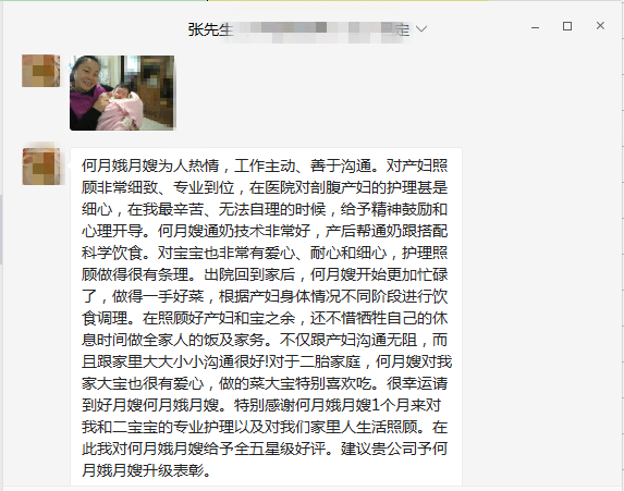 何月娥月嫂為人熱情,工作主動、善于溝通。對產(chǎn)婦照顧非常細致、專業(yè)到位,在醫(yī)院對剖腹產(chǎn)婦的護理甚是細心,在我最辛苦、無法自理的時候,給予精神鼓勵和心理開導。何月嫂通奶技術非常好,產(chǎn)后幫通奶跟搭配科學飲食。對寶寶也非常有愛心、耐心和細心,護理照顧做得很有條理。出院回到家后,何月嫂開始更加忙碌了,做得一手好菜,根據(jù)產(chǎn)婦身體情況不同階段進行飲食調(diào)理。在照顧好產(chǎn)婦和寶之余,還不惜犧牲自己的休息時間做全家人的飯及家務。不僅跟產(chǎn)婦溝通無阻,而且跟家里大大小小溝通很好!對于二胎家庭,何月嫂對我家大寶也很有愛心,做的菜大寶特別喜歡吃。很幸運請到好月嫂何月娥月嫂。特別感謝何月娥月嫂1個月來對我和二寶寶的專業(yè)護理以及對我們家里人生活照顧。在此我對何月娥月嫂給予全五星級好評。建議貴公司予何月娥月嫂升級表彰。