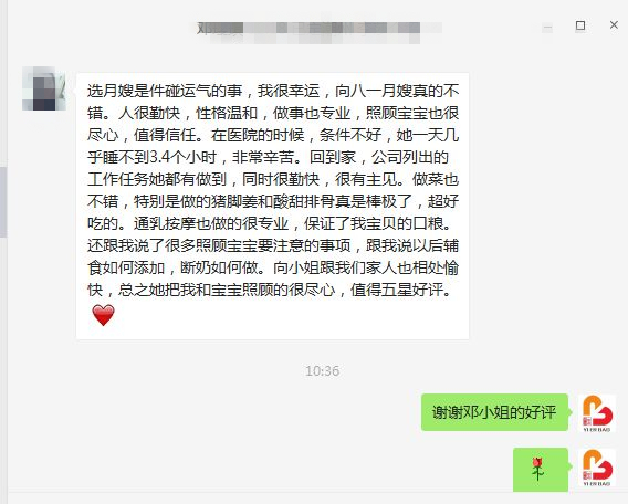 很慶幸最后選擇了你們公司,遇到了這么好的阿姨,特別感激向阿姨這么多天對(duì)我和寶寶還有我們家人的照顧,向阿姨特別勤快,對(duì)寶寶也是非常細(xì)心,我們家人對(duì)她都特別感激她,把向阿姨推薦給了身邊很多可能有需要的朋友,如果以后有需要我還會(huì)選擇向阿姨的,這么多天的相處真的太舍不得了