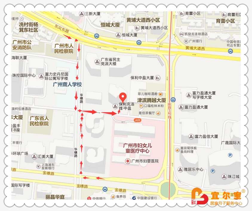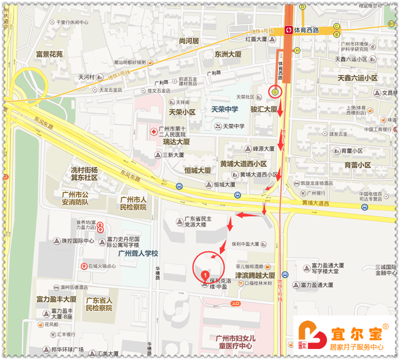 地鐵:1號(hào)線與3號(hào)線的體育西路站G出口,面向馬路,往右邊華夏路方向直走,經(jīng)過(guò)華夏銀行—民生銀行,然后過(guò)人行隧道,隧道右邊往前走,到公交站牌后面就可見到保利克洛維廣場(chǎng)-中盈大廈,珠江婦幼北門對(duì)面,如下圖