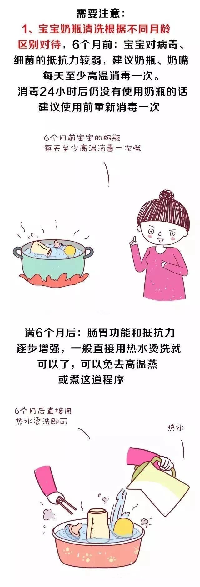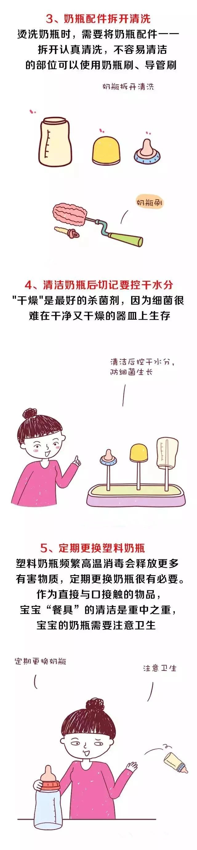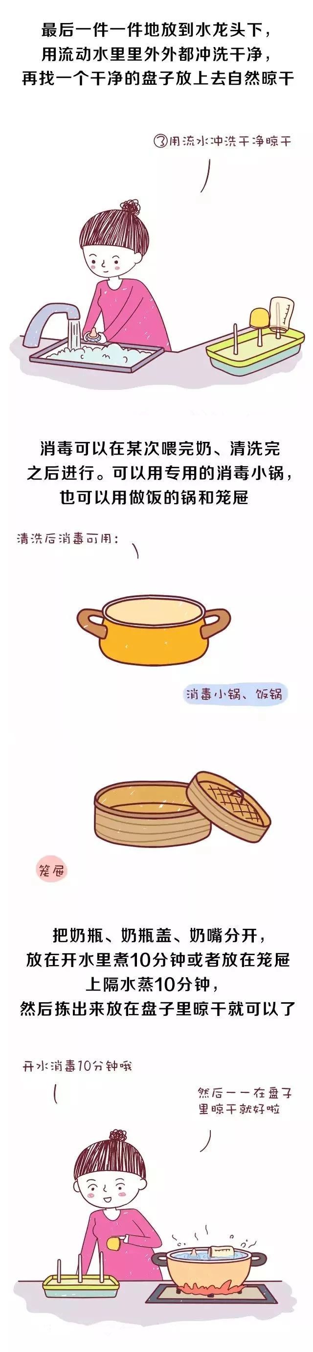 用開水燙洗,并用奶瓶刷刷洗后,控干奶瓶內的水即可。干燥是最好的“消毒劑”,即使煮沸消毒,也要控干奶瓶和奶嘴上的水。